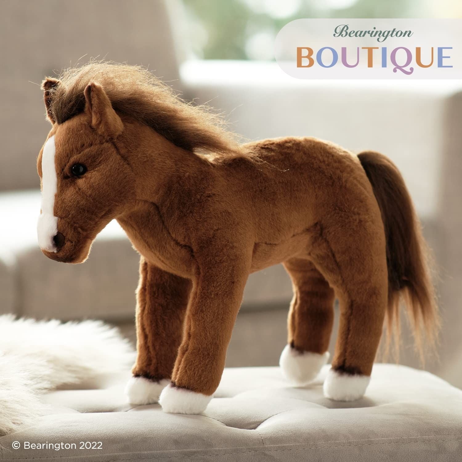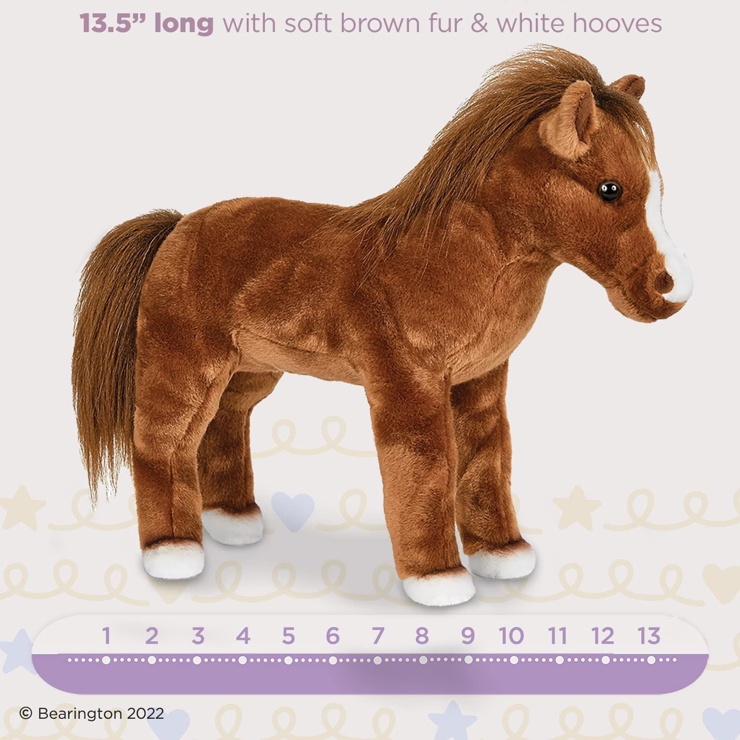 Meet Blaze: With ultra-soft brown fur, a hand-sewn face and realistic details, this 13.5’’ plush horse has four white hooves and is positioned to look like a real horse