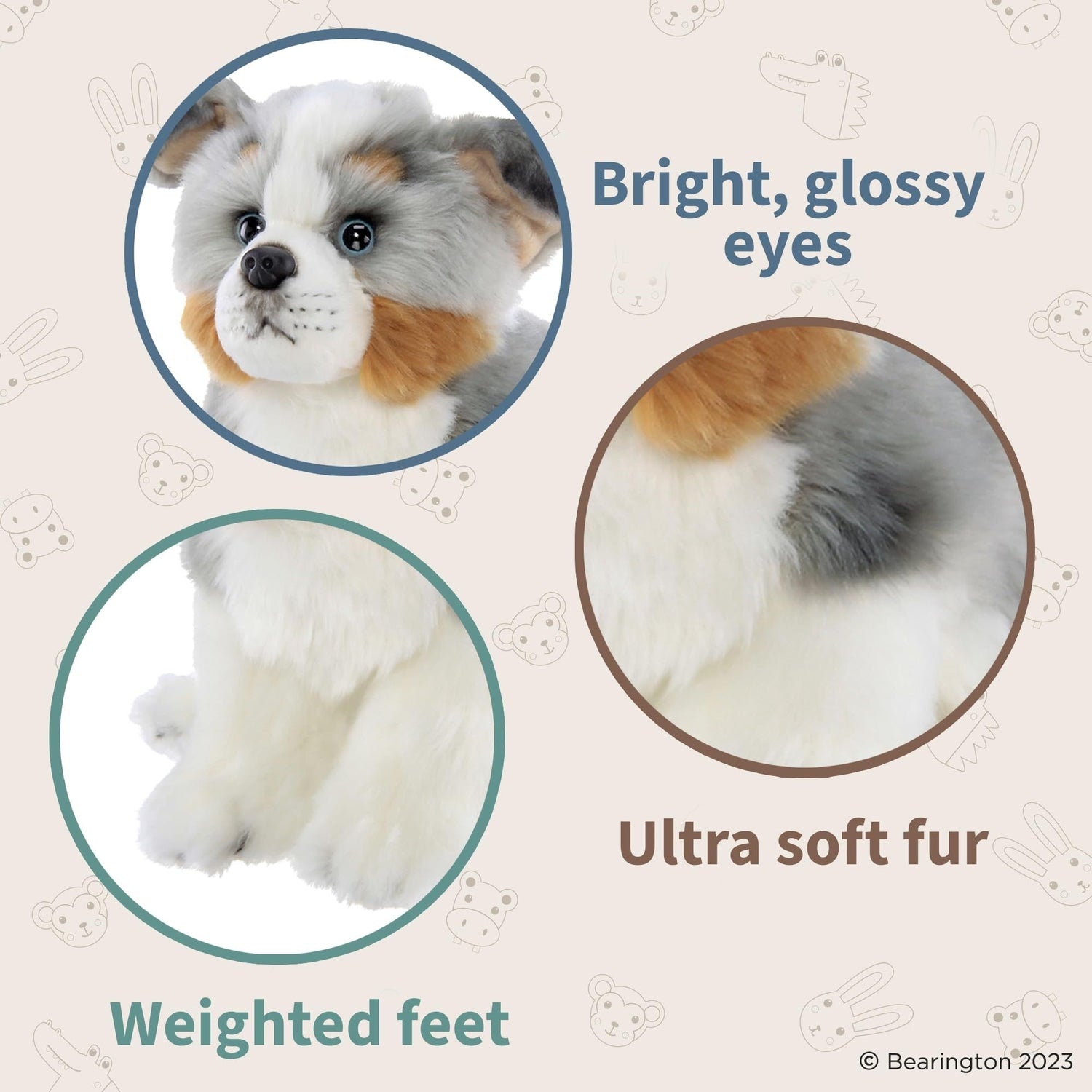 MEET HOGAN: The 13-inch Australian Shepherd plush dog that masters fluffiness, adorableness, and cuddliness. Crafted to be an ideal playmate for babies and kids, Hogan promises endless cuddle sessions. This lovable stuffed dog is ready to become a cherished addition to any toy collection.
