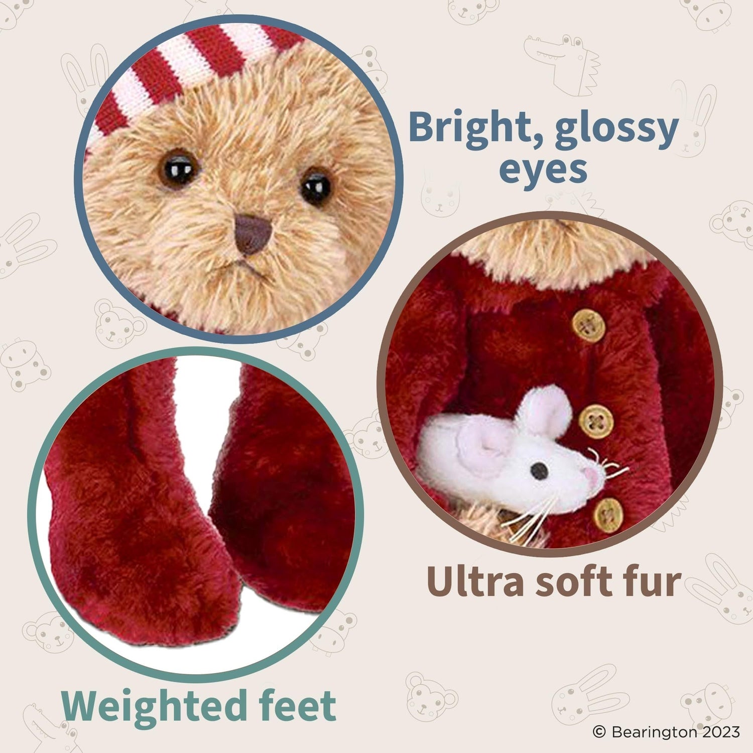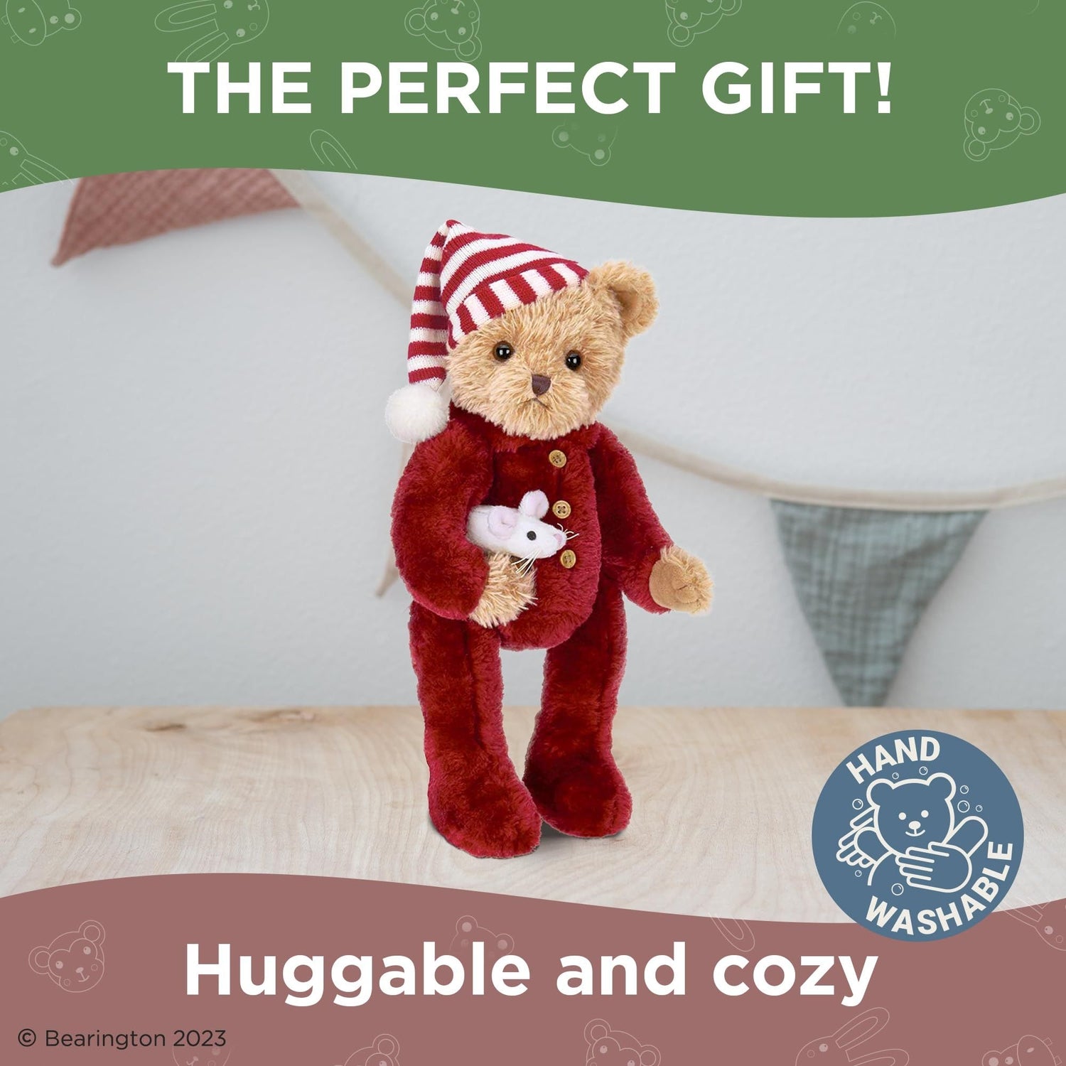 CHRISTMAS CLASSIC: Illuminate the festive spirit with our Christmas Classic, a 14” tall adorably cute teddy bear. Inspired by 'Twas the Night Before Christmas, this holiday bear is garbed with a red and white knitted nightcap, keeping the holiday vibe alive. A delightful gift to treasure, our Christmas teddy bear comes with a lovable mouse buddy. Its surface is washable, making it easy to clean. Touch, hug and savor the season's joy with our Christmas bear!