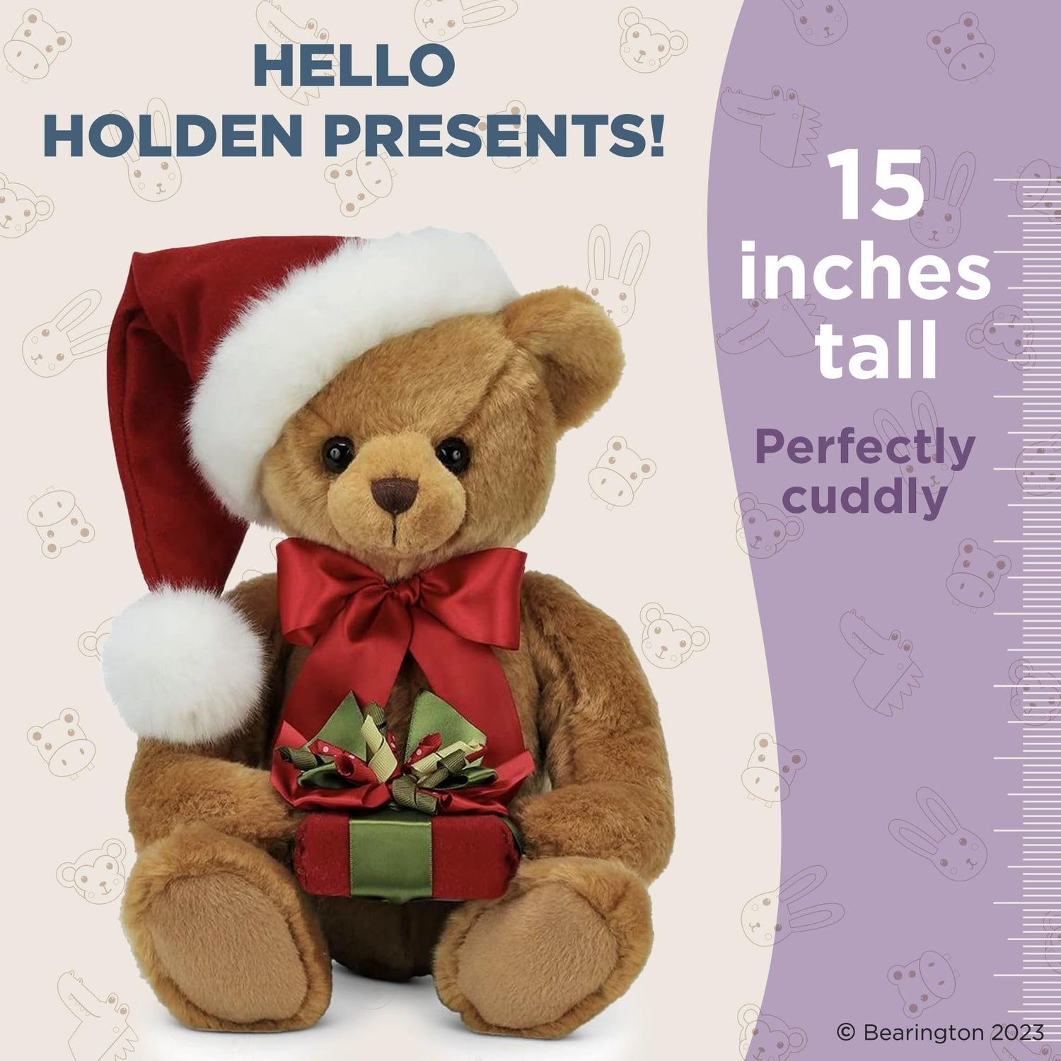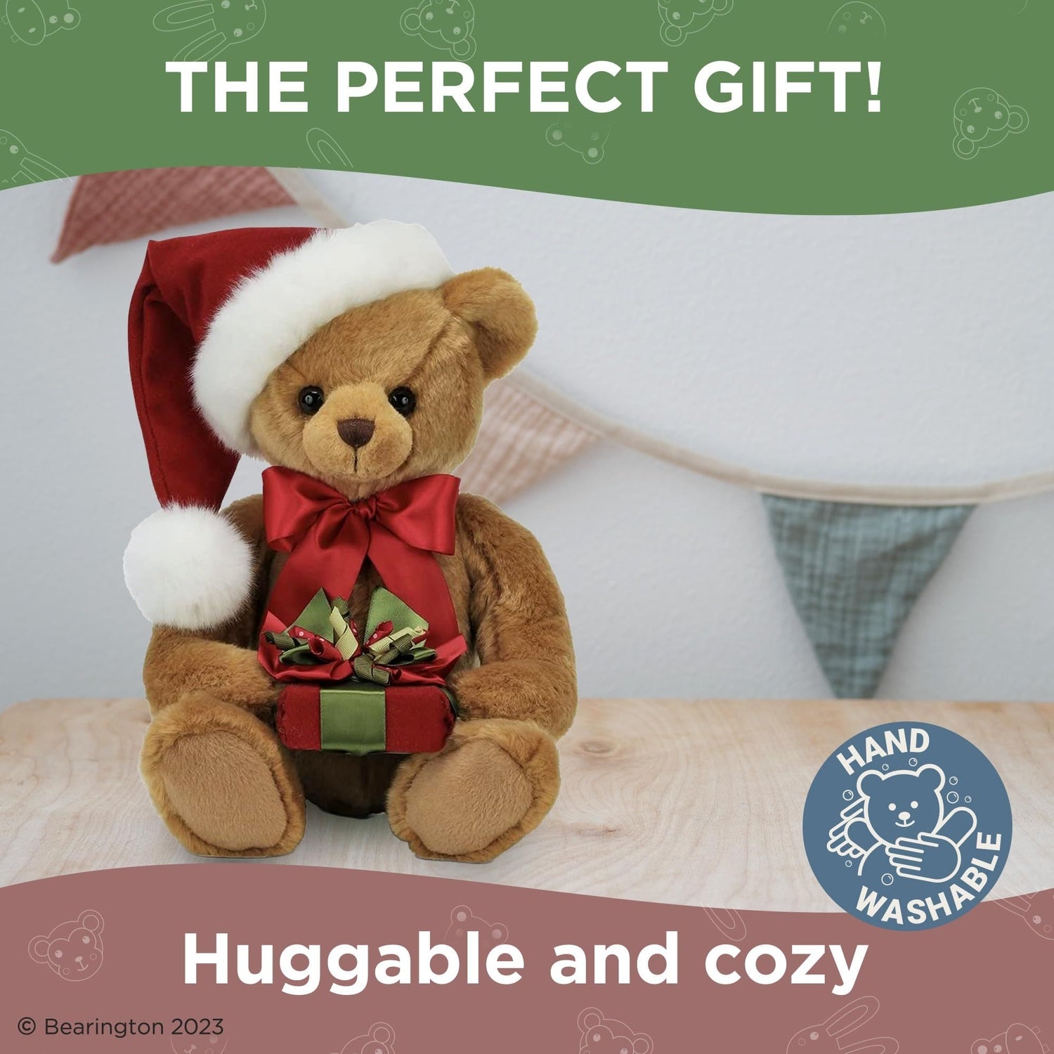 HOLDEN TEDDY BEAR: Meet Holden, the epitome of Christmas delight. This 15" tall, cuddly brown teddy bear is an adorable addition to your festive décor. Boasting a hand-stitched nose, a Santa hat, and a bright red bow, Holden is perfect for delivering holiday cheer. He embraces the essence of a classic Christmas teddy bear, while holding a holiday present that adds a touch of intrigue. His surface-washable material makes keeping him clean a breeze.