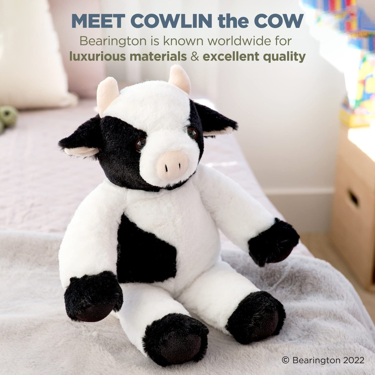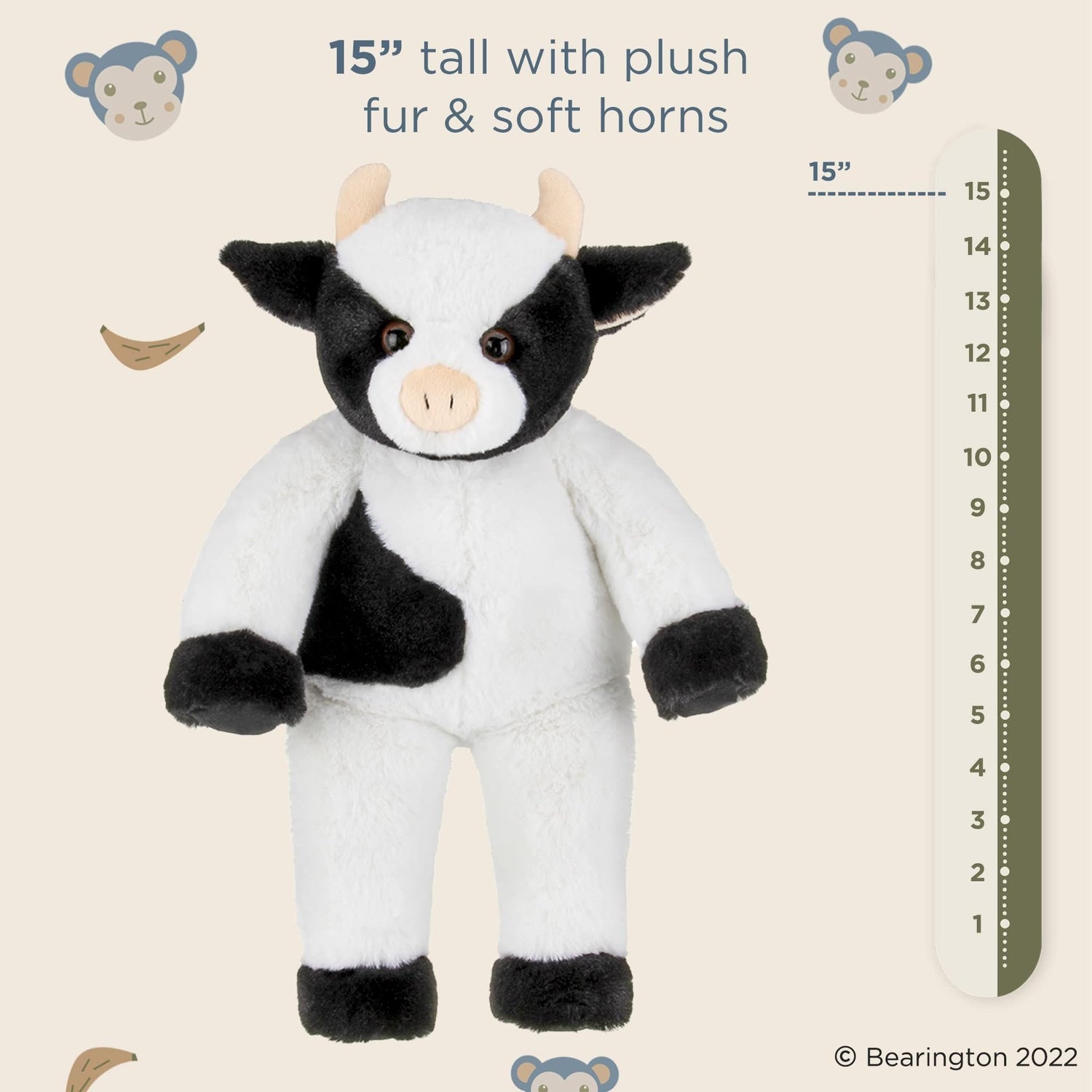 MEET COWLIN THE COW: With ultra-soft faux-fur and a hand-sewn tail, this adorable 15’’ cow is a soft and snuggly farm animal. Designed with premium black and white velour faux-fur