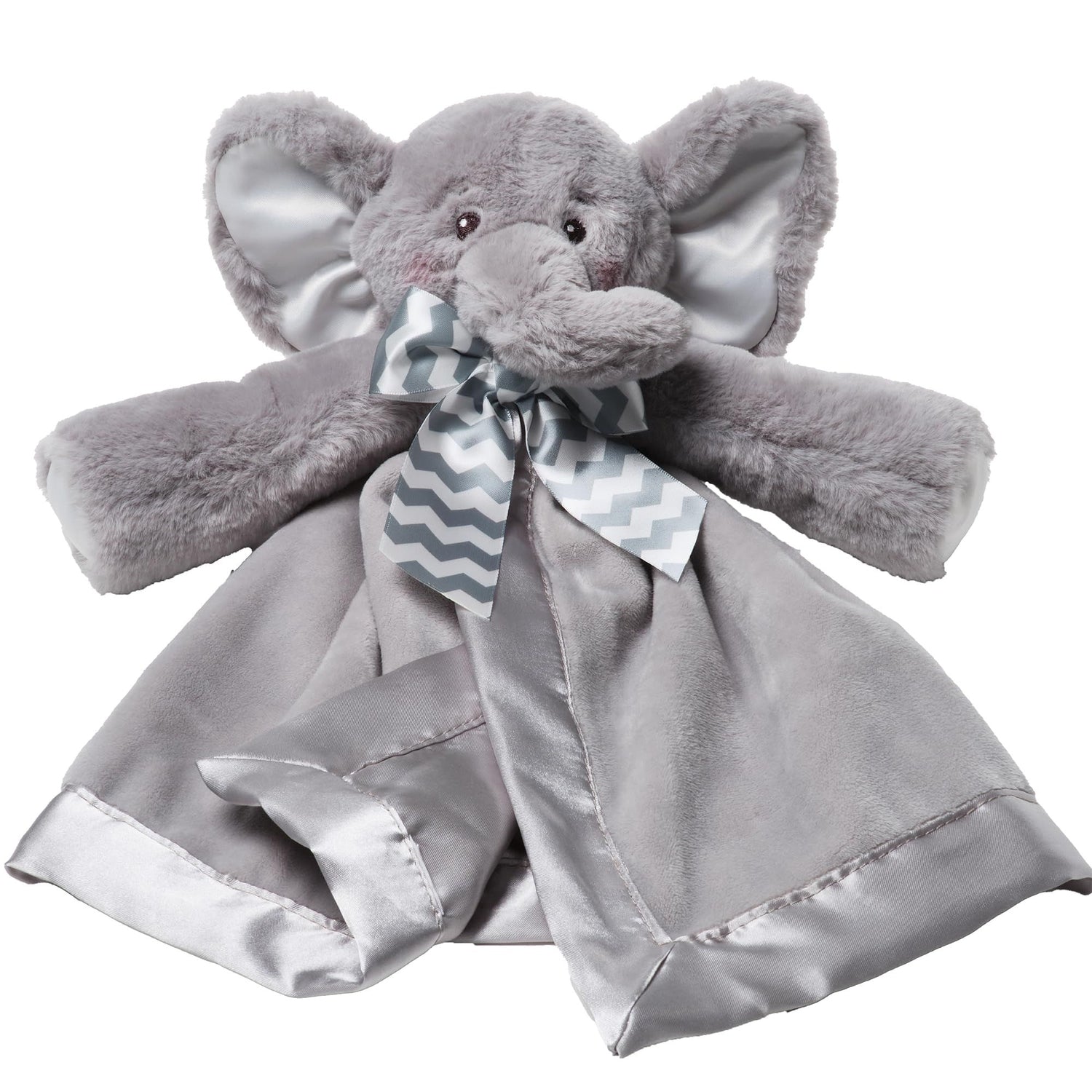 PLAYFUL DESIGN: This baby lovey blanket boasts an adorable baby elephant head and arms that are sure to melt your heart. The silky satin trim adds a touch of luxury, framing the plush elephant beautifully. Its white satin ears stand out, complemented by embroidered safety eyes that ensure a safe and huggable playtime. Complete with a chevron satin bow, this security blanket with stuffed animal is an irresistible buddy for your little one's adventures and bedtime snuggles.