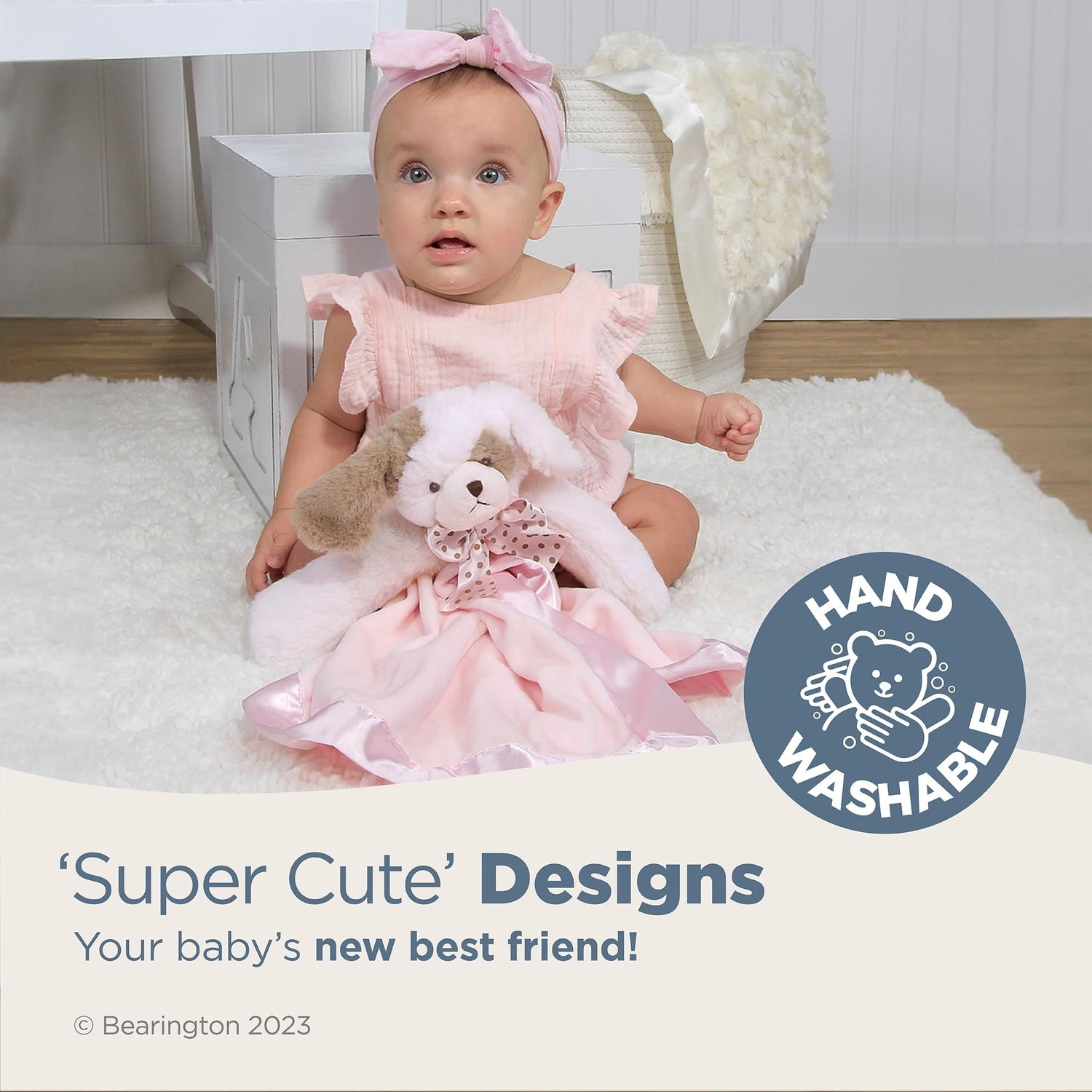 PLAYFUL DESIGN: This baby dog lovey blanket boasts a cute puppy head and arms and features an adorable brown spotted eye. The satin trim adds a touch of luxury, framing the plush puppy beautifully, and features polka dot satin ears, an adorable brown eye patch, and ears. Complemented with embroidered safety eyes. Complete with a satin bow, this baby security blanket with stuffed animal is an irresistible buddy for your little one's adventures and bedtime snuggles.