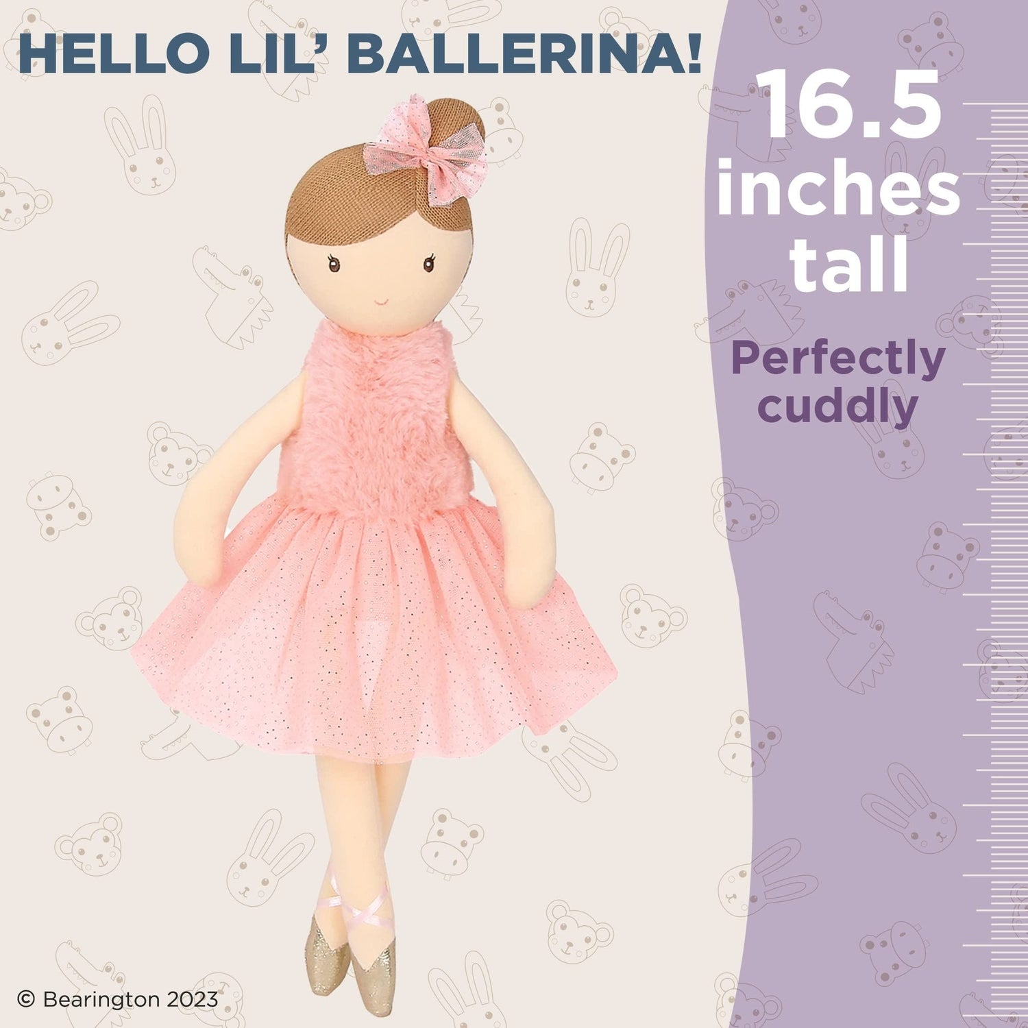 MEET LIL' BALLERINA BRUNETTE: The 16.5" Ballerina Doll - a perfect blend of cuteness and grace. With stitched features, plush top, pink tulle tutu, ballet shoes, and a decorative bow, she's every ballerina's dream! A delightful gift or keepsake, this surface-washable doll brings joy and inspiration to kids. Explore our collection of cuddly ballerina stuffed animals and dolls for more ballet toy options and charming ballerina gifts for girls.
