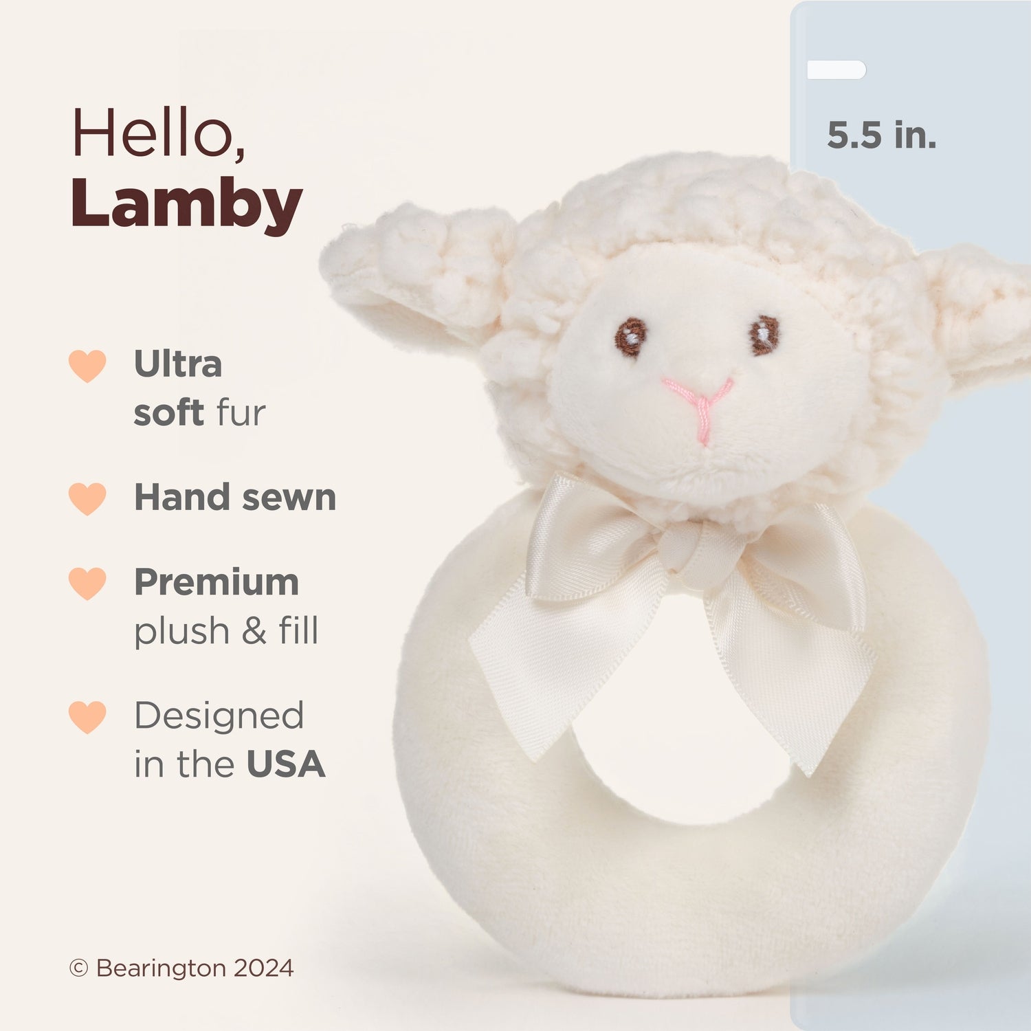 SAFE AND RELIABLE: Crafted with utmost care, this soft rattle toy is made from high-quality materials, giving parents peace of mind. Compact and lightweight, the Bearington Baby Lamby rattle is designed for easy handling by tiny hands. It's a perfect travel companion, whether in the car, stroller, or crib, keeping your baby comforted and engaged wherever they go.