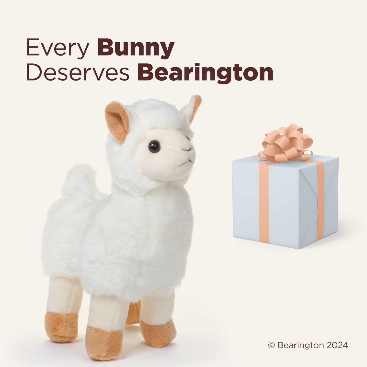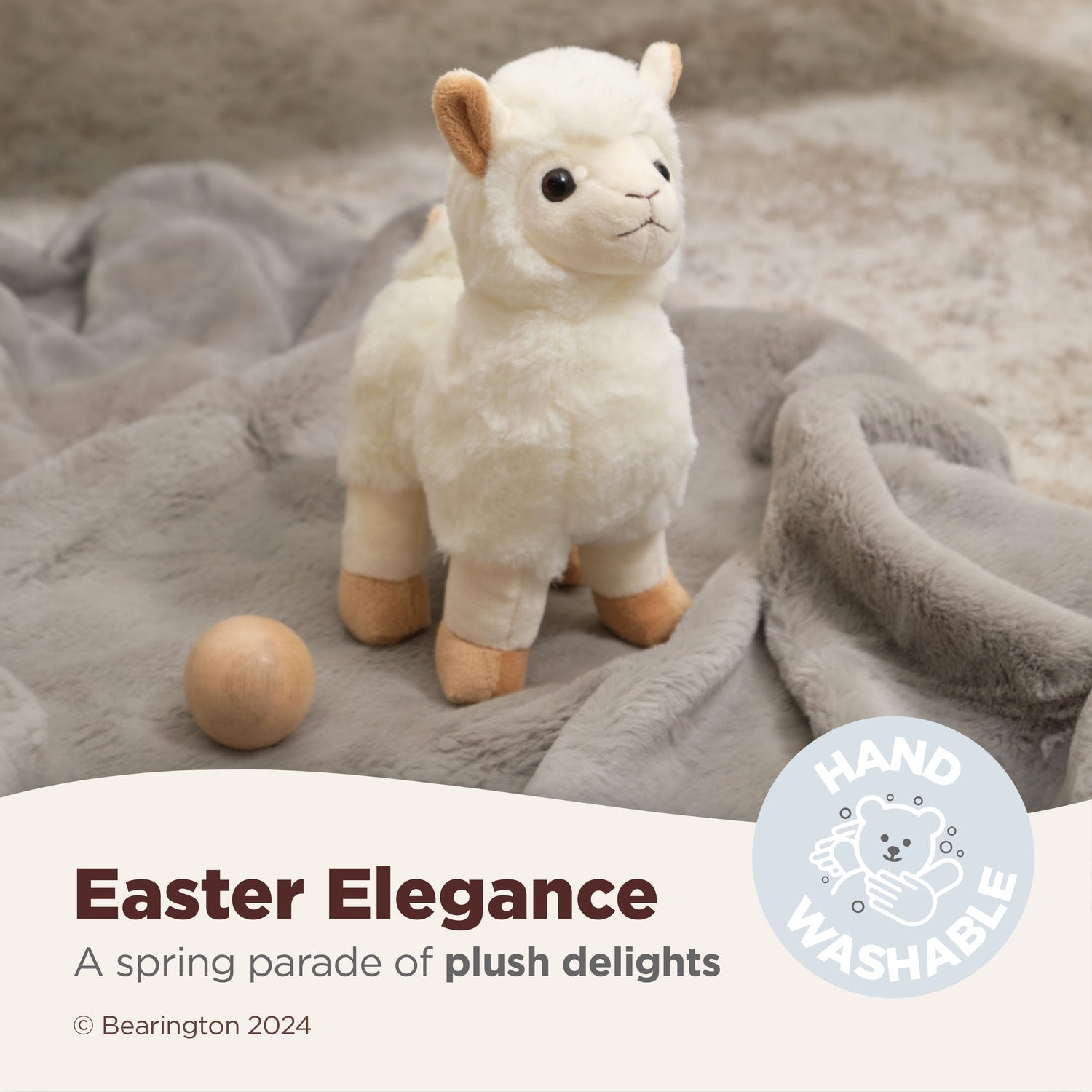 Adorably cute 7" long white llama plush toy with soft fur and sweet expressive face, machine washable