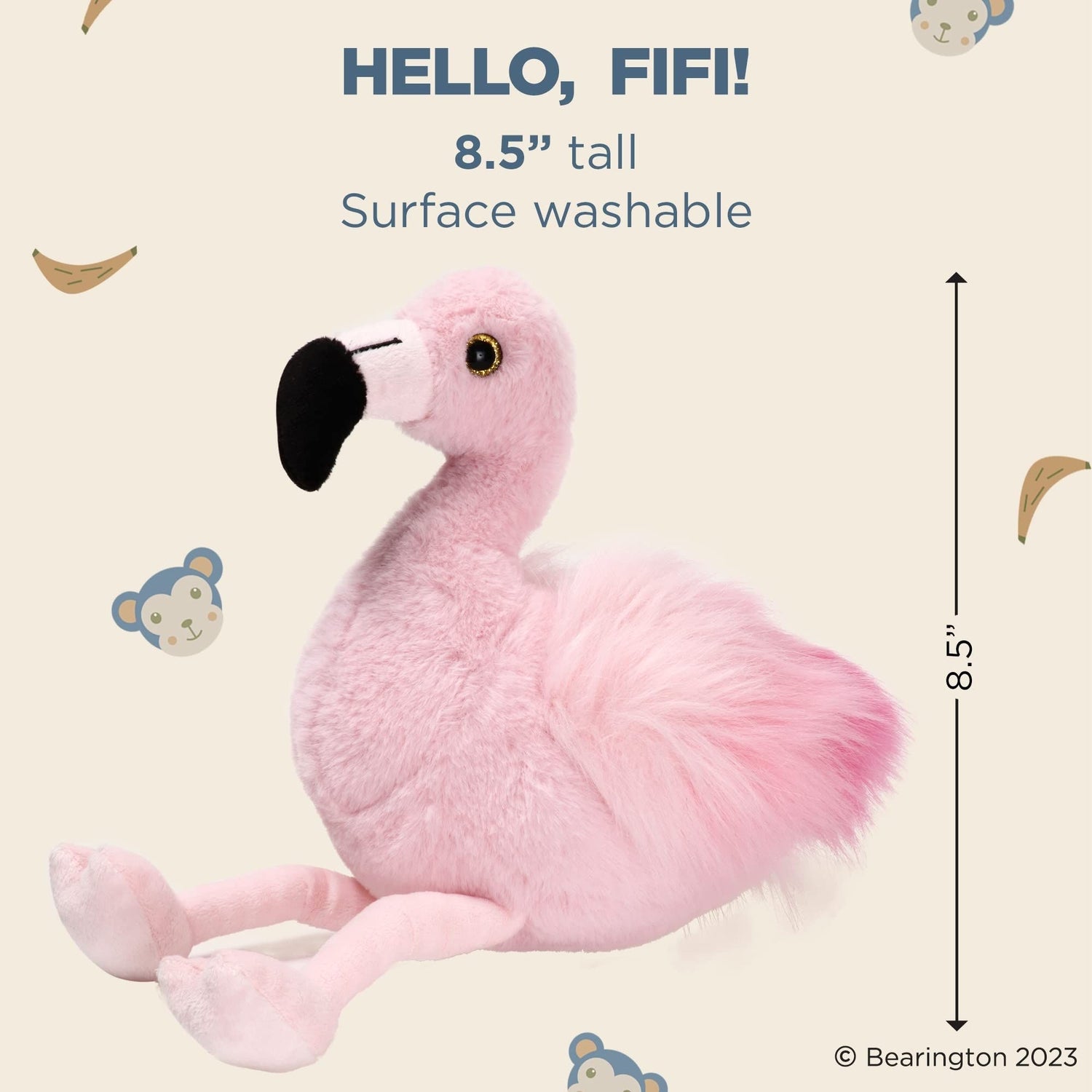Meet Fifi: Made of feather-like pink plush with a tufted tail, bright eyes and hand-sewn bird details, this fabulous little flamingo is designed to win hearts